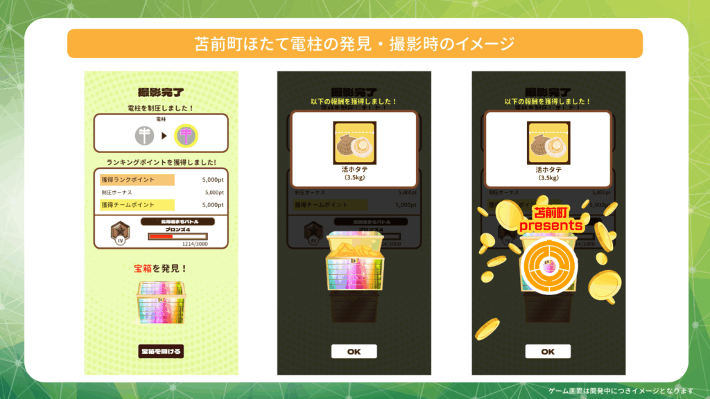 ①苫前町ほたて電柱:撮影することで、苫前町の漁師直送「活ほたて」(3年貝3.5kg(20〜25枚程度)、剥きヘラ付き)の引き換え券を獲得できます。電柱の位置はランダムで合計5本登場します。引き換え券の獲得後に申請を行うことで賞品が配送されます(道内:普通配送、道外:クール便配送)。※ほたての配送は10月以降を予定しています。