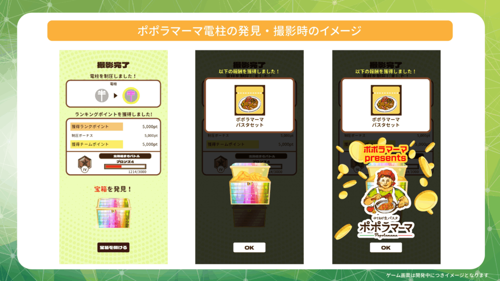 企業の協賛により賞品が得られるお宝電柱として「ポポラマーマ電柱」が登場します。「ポポラマーマ電柱」は、「ポポラマーマ」とコラボした電柱であり、見つけて撮影することでパスタセットが進呈されます。