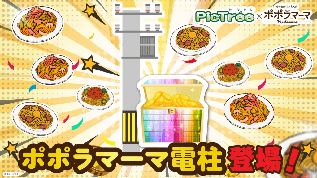 「ポポラマーマ電柱」の登場を記念して、公式Xのフォロー&リポストキャンペーンを実施します。@popolamama と @pictree_dea をフォローし、該当の投稿をリポスト(引用リポストもOK)すると、ポポラマーマパスタセットやピクトレオリジナルモバイルバッテリー、Amazonギフトカードをプレゼントします。