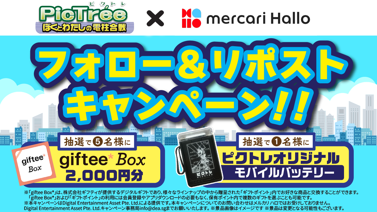 シンガポールを拠点に「社会貢献を、熱狂的なゲームに変える」画期的なプラットフォームで注目を集めるDigital Entertainment Asset Pte. Ltd.(本社:シンガポール、Founder & CEO:吉田 直人、Founder & Co-CEO:山田 耕三、以下「DEA」)とGreenway Grid Global Pte.Ltd.(本社:シンガポール、代表取締役社長:大石 峰士、以下「GGG」)が共同で設立したGrowth Ring Grid Pte. Ltd.(本社:シンガポール、取締役CEO/代表:福田 史、Co-CEO/共同代表:鬼頭 和希、以下「GRG」)が運営する参加型社会貢献ゲーム「PicTrée(ピクトレ)」において、株式会社メルカリ(以下「メルカリ」)が展開するスキマバイトサービス「メルカリ ハロ」とのフォロー&リポストキャンペーンをスタートするとともにピクトレプレイ未経験者を対象としたゲームテスター募集をお知らせします。