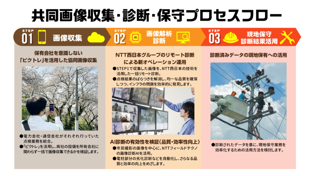 本実証実験は、市民による電柱の撮影、AIを活用した画像診断、専門オペレーターによるリモート診断を組み合わせることで、電力会社と通信会社が同じ仕組みのもとで効率的に点検できる新しい「共同点検モデル」の実現性を検証します。市民撮影イベントで取得された画像を共通の基盤で扱い、診断基準や作業フローを揃えることで、両社が同じ仕組みのもとで効率よく、高品質に点検できる、サステナブルな点検体制づくりに繋げていくことを目的としています。
