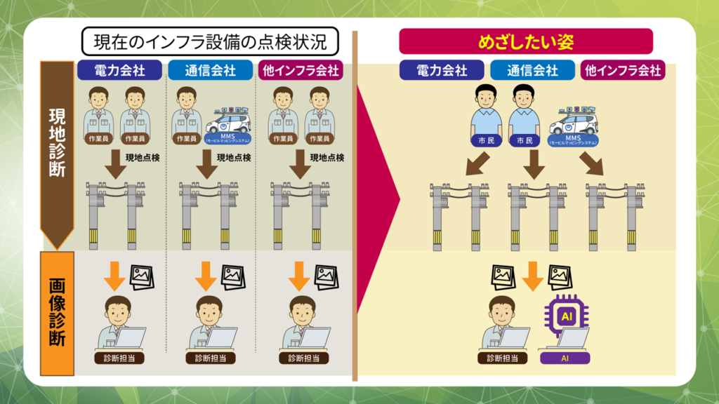 電信柱や電力柱に代表される電柱や各種インフラ構造物に対する点検においては、労働生産人口の減少もあり、AIや画像を活用した点検業務オペレーションの高度化が課題となっています。そうした状況に対して、通信会社・電力会社を横断した取り組みにより、限られた人員で高い点検品質を保ちつつ、サステナブルな事業運営を新たに構築することを目指しています。