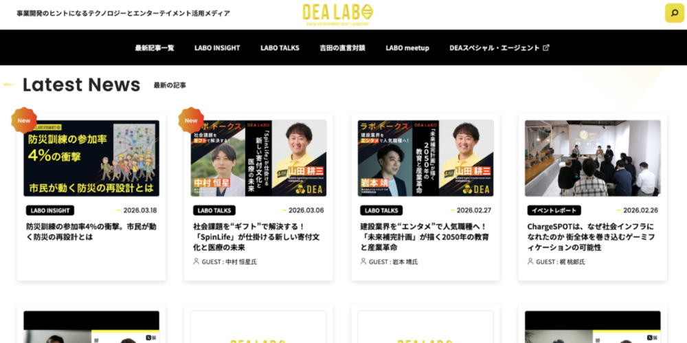 株式会社Digital Entertainment Asset(本社:東京都港区、代表取締役会長:吉田 直人、代表取締役社長:山田 耕三、以下「DEA」)は2026年3月31日より、DEA LABOのコンテンツサイトをリニューアル公開いたしました。DEA LABOは、ゲームのロジックで社会を設計し直す「Public Play Design」の研究と実装を行うとともに、「事業開発のヒントとなるテクノロジーとエンターテイメント活用メディア」として情報発信を行っています。