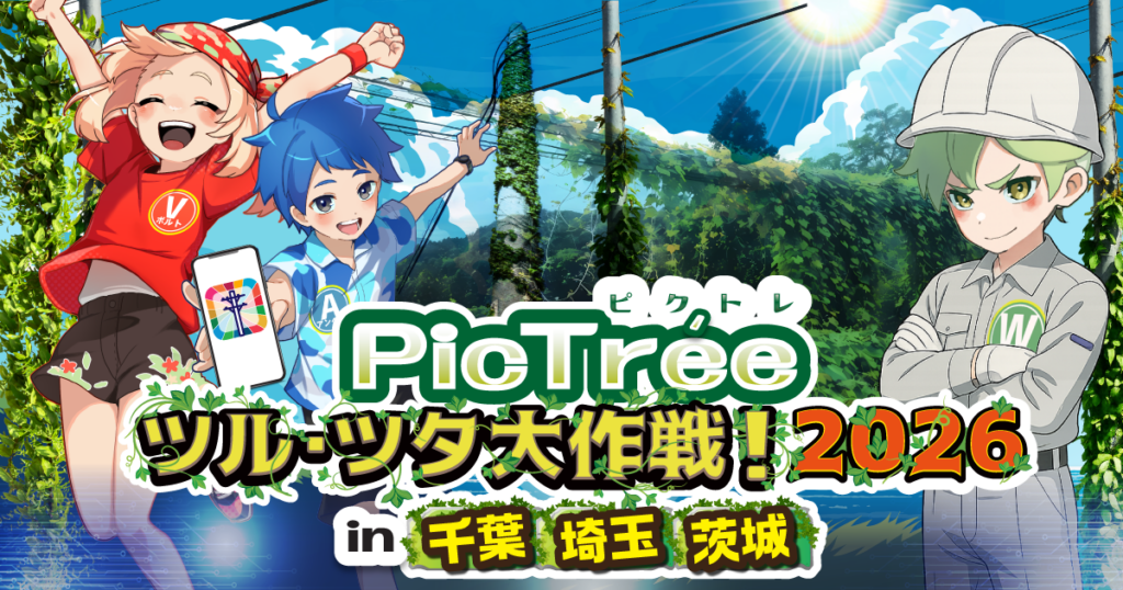 現在は、千葉県全域、埼玉県一部地域、茨城県一部地域にて、「ツル・ツタ大作戦 2026 in 千葉」「ツル・ツタ大作戦 2026 in 埼玉」「ツル・ツタ大作戦 2026 in 茨城」を開催中です。電柱へのツル・ツタの巻き付きを早期発見することを目的として開催しています。